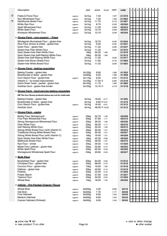 Description size price %u00a3/unit RRP code 123456789%u2752 Pasta & Pizza Flour organic 5x1kg 7.40 1.97 51070Rye Wholemeal Flour organic 5x1kg 7.25 1.93 51065%u2752 Seedhouse Bread Flour organic 5x1kg 11.75 3.13 51067White Rye Flour organic 5x1kg 8.75 2.33 40550Spelt Wholemeal Flour organic 5x1kg 11.20 2.99 40553White Spelt Flour organic 5x1kg 13.10 3.49 40554Khorasan Wholemeal Flour organic 5x1kg 13.10 3.49 40556%u274a Doves Farm - non-organic - FreeeWholegrain Buckwheat Flour - gluten-free 5x1kg 18.75 5.00 51044Rice Flour (brown & white) - gluten-free 5x1kg 9.20 2.45 51037Gram Flour - gluten-free 5x1kg 11.25 3.00 51047Gluten-free Plain White Flour 5x1kg 11.25 3.00 51075Sack Gluten-free Plain White Flour 16kg 30.30 1.89 51076Sack Gluten-free Self-Raising White Flour 16kg 30.30 1.89 51074Gluten-free Self-Raising White Flour 5x1kg 11.25 3.00 51077Gluten-free Brown Bread Flour 5x1kg 11.85 3.16 51080Gluten-free White Bread Flour 5x1kg 11.25 3.00 51082%u274a Doves Farm - baking requisitesBaking Powder - gluten-free 5x130g 6.95 1.85 41203Bicarbonate of Soda - gluten-free 5x200g 6.35 1.69 41208Corn Starch Flour - gluten-free organic 5x110g 8.25 2.20 41212Vitamin C - for bread improvement 5x120g 17.50 V 5.60 41216Quick Dried Yeast - packet - gluten-free 8x125g 11.10 1.85 51085Xanthan Gum - gluten-free binder 5x100g 13.10 V 4.19 41218%u274a Doves Farm - food service baking requisitesNB The four Doves products below are not for retail saleBaking Powder - gluten-free 3x1kg 18.50 6.17 41305Bicarbonate of Soda - gluten-free 3x1kg 9.80 V 3.27 41310Corn Starch Flour - gluten-free organic 3x1kg 19.40 6.47 41312Xanthan Gum 3x1kg 48.00 V 16.00 41315%u274a Doves Farm - sacksBarley Flour Stoneground organic 25kg 34.70 1.39 40508Fine Plain Wholemeal Flour organic 25kg 27.80 1.11 40510Strong Stoneground Wholemeal Flour organic 25kg 26.50 1.06 40530Plain White Flour organic 25kg 29.20 1.17 40570Self Raising White Flour organic 25kg 32.45 1.30 40572Strong White Bread Flour (with Vitamin C) organic 25kg 30.30 1.21 40555Traditional Strong White Bread Flour organic 25kg 30.30 1.21 40557Strong White Bread Flour (with Vitamin C) organic 16kg 19.40 1.21 40558Sack Gluten-free Plain White Flour organic 16kg 42.50 2.66 40559Malthouse Bread Flour organic 25kg 39.30 1.57 40575Rye Flour - whole organic 25kg 29.50 1.18 41030Maize Flour (yellow) - gluten-free organic 25kg 53.00 2.12 40525White Spelt Flour organic 25kg 62.20 2.49 40526Stoneground Wholemeal Spelt Flour organic 25kg 50.85 2.03 40527%u274a Bulk FlourBuckwheat Flour - gluten-free organic 25kg 64.00 2.56 41015Chickpea Flour - gluten-free organic 25kg 68.00 2.72 41016Coconut Flour - gluten-free organic 10kg 19.00 1.90 41018Oatbran - gluten-free organic 20kg 43.00 2.15 41019Polenta organic 25kg 54.00 2.16 41026Potato Starch organic 25kg 57.00 2.28 41027Tapioca Flour organic 25kg 55.00 2.20 41050Wheat Bran organic 15kg 18.00 1.20 40520%u274a Infinity - Pre-Packed Organic FloursWheat Bran organic 6x250g 4.25 0.95 3010Oat Bran organic 6x500g 7.70 1.71 3038Fine Oatmeal organic 6x500g 6.95 1.54 3040Medium Oatmeal organic 6x500g 6.95 1.54 3045Coarse Oatmeal (Pinhead) organic 6x500g 6.95 1.54 3050%u25b2 price rise %u25bc fall%u2748 new product %u2752 on offer Page 24%u272b size or other change%u25c6 offer ended