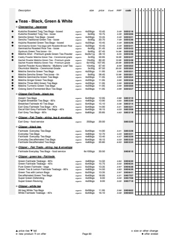 Description size price %u00a3/unit RRP code 123456789%u25a0 Teas - Black, Green & White%u274a Clearspring - Japanese%u25c6 Kukicha Roasted Twig Tea Bags - boxed organic 4x20bgs 10.45 3.49 500516Kukicha Roasted Twig Tea - loose organic 6x90g 19.75 4.39 500506%u25c6 Sencha Green Tea Bags - boxed organic 4x20bgs 10.45 3.49 500521Sencha Traditional Green Tea - loose organic 6x90g 33.70 7.49 500536%u25c6 Hojicha Roasted Green Tea Bags - boxed organic 4x20bgs 10.45 3.49 500526%u25c6 Genmaicha Green Tea bags with Roasted Brown Rice organic 4x20bgs 10.45 3.49 500541Genmaicha Roasted Rice Tea - loose organic 6x90g 31.45 6.99 500543Gyokuro Green Tea loose - tin organic 6x85g 67.45 14.99 500559%u25c6 Matcha Shot - Premium grade Green Tea Powder organic 6x(8x1)g 28.10 6.25 500546%u25c6 Caddy Powder Matcha Green Tea - Ceremonial grade organic 4x30g 50.95 16.99 500547%u25c6 Sachet Powder Matcha Green Tea - Premium grade organic 10x40g 82.40 10.99 500548Sachet Powder Matcha Green Tea - Premium grade organic 6x100g 107.95 23.99 500549Sachet Powder Kuwa Matcha - Mulberry Leaf Tea organic 10x40g 67.40 8.99 500562Okumidori Matcha - Ceremonial Grade organic 3x30g 67.50 30.00 500564%u25c6 Matcha Sencha Green Tea Bags organic 4x20bgs 11.95 3.99 500551Matcha Sencha Green Tea loose - tin organic 6x85g 58.45 12.99 500561%u25c6 Matcha Genmaicha Green Tea Bags organic 4x20bgs 11.95 3.99 500554%u25c6 Matcha Ginger Green Tea Bags organic 4x20bgs 11.95 3.99 500556%u25c6 Matcha Three Mint Green Tea Bags organic 4x20bgs 11.95 3.99 500558%u25c6 Matcha Turmeric Green Tea Bags organic 4x20bgs 11.95 3.99 500560%u25c6 Oolong Semi-Fermented Blue Tea Bags organic 4x20bgs 11.95 3.99 500557%u274a Clipper FairTrade - black tea Assam Tea Bags organic 6x40bgs 12.95 2.88 580310English Breakfast Tea Bags - 80's organic 4x80bgs 13.90 4.65 580330Breakfast Fairtrade 40 Tea Bags organic 6x40bgs 15.10 3.36 580314Earl Grey Fairtrade Tea Bags - 40's organic 6x40bgs 14.90 3.31 580321Decaf Earl Grey Fairtrade Tea Bags - 40's organic 6x40bgs 18.15 4.03 580308Earl Grey Tea Bags - 80's organic 6x80bgs 20.85 4.63 580318%u274a Clipper - Fair Trade - string, tag & envelope Earl Grey - food service organic 250bgs 20.00 580320%u274a Clipper - black tea Fairtrade Everyday Tea Bags organic 6x40bgs 14.90 3.31 580328Everyday Tea Bags organic 4x80bgs 12.70 4.23 580331Fairtrade Everyday Tea Bags organic 4x80bgs 13.40 4.47 580329Everyday Decaffeinated Tea Bags organic 6x40bgs 18.15 4.03 580332Fairtrade Decaffeinated Tea Bags organic 4x80bgs 20.80 6.93 580334%u274a Clipper - Fair Trade - string, tag & envelopeFairtrade Everyday Tea Bags - food service 6x100bgs 33.50 590810%u274a Clipper - green tea - Fairtrade Green Fairtrade Teabags - 80's organic 4x80bgs 14.50 4.84 590630Green Fairtrade Teabags - 40's organic 6x40bgs 15.75 3.50 590634Pure Green Fairtrade - bags organic 6x20bgs 13.35 2.97 590638Green Tea & Lemon Fairtrade Teabags - 80's organic 4x80bgs 14.50 4.83 590639Green Tea with Lemon Bags organic 6x20bgs 13.35 2.97 590641Decaffeinated Green Tea Bags organic 6x40bgs 18.95 4.21 590707Super Green Defending organic 4x20bgs 9.00 3.00 590708Super Green Reviving organic 4x20bgs 9.00 3.00 590710%u274a Clipper - white tea26 bag White Tea Bags organic 6x26bgs 11.95 2.66 590682White Fairtrade Teabags - 40's organic 6x40bgs 16.10 3.58 590683%u25b2 price rise %u25bc fall%u2748 new product %u2752 on offer Page 80%u272b size or other change%u25c6 offer ended