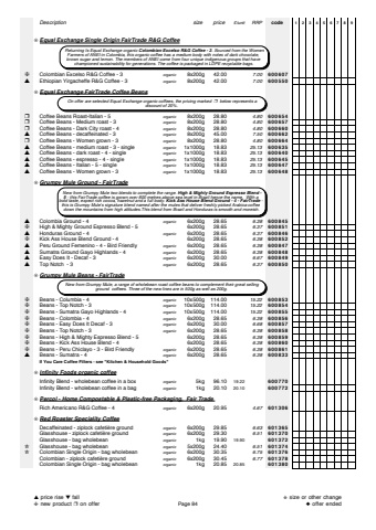 Description size price %u00a3/unit RRP code 123456789%u274a Equal Exchange Single Origin FairTrade R&G Coffee%u2748 Colombian Excelso R&G Coffee - 3 organic 8x200g 42.00 7.00 600607%u25b2 Ethiopian Yirgacheffe R&G Coffee - 3 organic 8x200g 42.00 7.00 600550%u274a Equal Exchange FairTrade Coffee Beans%u2752 Coffee Beans Roast-Italian - 5 organic 8x200g 28.80 4.80 600654%u2752 Coffee Beans - Medium roast - 3 organic 8x200g 28.80 4.80 600657%u2752 Coffee Beans - Dark City roast - 4 organic 8x200g 28.80 4.80 600660%u25b2 Coffee Beans - decaffeinated - 3 organic 8x200g 45.00 7.50 600662%u2752 Coffee Beans - Women grown - 3 organic 8x200g 28.80 4.80 600664%u25b2 Coffee Beans - medium roast - 3 - single organic 1x1000g 18.83 25.13 600635%u25b2 Coffee Beans - dark roast - 4 - single organic 1x1000g 18.83 25.13 600640%u25b2 Coffee Beans - espresso - 4 - single organic 1x1000g 18.83 25.13 600645%u25b2 Coffee Beans - Italian - 5 - single organic 1x1000g 18.83 25.13 600647%u25b2 Coffee Beans - Women grown - 3 organic 1x1000g 18.83 25.13 600648%u274a Grumpy Mule Ground - FairTrade%u25b2 Colombia Ground - 4 organic 6x200g 28.65 6.38 600845%u2748 High & Mighty Ground Espresso Blend - 5 6x200g 28.65 6.37 600851%u25b2 Honduras Ground - 4 organic 6x200g 28.65 6.37 600846%u2748 Kick Ass House Blend Ground - 4 6x200g 28.65 6.38 600852%u25b2 Peru Ground Femenino - 4 - Bird Friendly organic 6x200g 28.65 6.38 600847%u25b2 Sumatra Ground Gayo Highlands - 4 organic 6x200g 28.65 6.38 600848%u25b2 Easy Does It - Decaf - 3 organic 6x200g 30.00 6.67 600849%u25b2 Top Notch - 3 organic 6x200g 28.65 6.37 600850%u274a Grumpy Mule Beans - FairTrade%u2748 Beans - Columbia - 4 organic 10x500g 114.00 15.22 600853%u2748 Beans - Top Notch - 3 organic 10x500g 114.00 15.22 600854%u2748 Beans - Sumatra Gayo Highlands - 4 organic 10x500g 114.00 15.22 600855%u2748 Beans - Colombia - 4 organic 6x200g 28.65 6.38 600856%u2748 Beans - Easy Does It Decaf - 3 organic 6x200g 30.00 6.68 600857%u2748 Beans - Top Notch - 3 organic 6x200g 28.65 6.38 600858%u2748 Beans - High & Mighty Espresso Blend - 5 6x200g 28.65 6.38 600859%u2748 Beans - Kick Ass House Blend - 4 6x200g 28.65 6.38 600860%u2748 Beans - Peru Chiclayo - 3 - Bird Friendly organic 6x200g 28.65 6.38 600861%u25b2 Beans - Sumatra - 4 organic 6x200g 28.65 6.38 600833If You Care Coffee Filters - see \%u274a Infinity Foods organic coffeeInfinity Blend - wholebean coffee in a box organic 5kg 96.10 19.22 600770Infinity Blend - wholebean coffee in a bag organic 1kg 20.10 20.10 600772%u274a Percol - Home Compostable & Plastic-free Packaging, Fair Trade Rich Americano R&G Coffee - 4 organic 6x200g 20.95 4.67 601306%u274a Red Roaster Speciality CoffeeDecaffeinated - ziplock cafeti%u00e8re ground organic 6x200g 29.85 6.63 601365Glasshouse - ziplock cafeti%u00e8re ground organic 6x200g 29.30 6.51 601370Glasshouse - bag wholebean organic 1kg 19.90 19.90 601372%u272b Glasshouse - bag wholebean organic 5x200g 24.40 6.51 601374%u272b Colombian Single Origin - bag wholebean organic 6x200g 30.35 6.75 601376Colombian - ziplock cafeti%u00e8re ground organic 6x200g 30.45 6.77 601378Colombian Single Origin - bag wholebean organic 1kg 20.85 20.85 601380 New from Grumpy Mule two blends to complete the range. High & Mighty Ground Espresso Blend -5 - this FairTrade coffee is grown over 800 metres above sea level in Brazil hence the name. With a bold taste, expect rich cocoa, hazelnut and a full body. Kick Ass House Blend Ground - 4 - FairTrade -this is Grumpy Mule's signature blend named after the mules that deliver freshly picked Arabica coffee down the mountains from high altitudes.This blend from Brazil and Honduras is smooth and moreish. New from Grumpy Mule, a range of wholebean roast coffee beans to complement their great selling ground coffees. Three of the new lines are in 500g as well as 200g. On offer are selected Equal Exchange organic coffees, the pricing marked %u2752 below represents a discount of 20%. Returning Is Equal Exchange organic Colombian Excelso R&G Coffee - 3. Sourced from the WomenFarmers of ANEI in Colombia, this organic coffee has a medium body with notes of dark chocolate, brown sugar and lemon. The members of ANEI come from four unique indigenous groups that have championed sustainability for generations. The coffee is packaged in LDPE recyclable bags.%u25b2 price rise %u25bc fall%u2748 new product %u2752 on offer Page 84%u272b size or other change%u25c6 offer ended