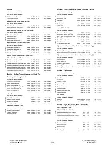 Coffee Caf%u00e9Direct FairTrade R&G15% off list March and April%u2752 Caf%u00e9Direct Colombia Reserva - 3 6x200g 21.40 4.75 600481%u2752 Caf%u00e9Direct Mayan Gold -5 organic 6x200g 21.40 4.75 600489Caf%u00e9Direct roast coffee beans FairTrade15% off list March and April%u2752 Whole Coffee Beans - Machu Picchu - 4 organic 6x200g 21.40 4.75 600497%u2752 Whole Coffee Beans - Mayan Gold - 5 organic 6x200g 21.40 4.75 600499Equal Exchange Original FairTrade R&G Coffee20% off list March and April%u2752 Dark City Roast Coffee Ground - 4 organic 8x200g 28.80 4.80 600610%u2752 Medium R&G Coffee - 3 organic 8x200g 28.80 4.80 600605%u2752 Italian Coffee R&G - 5 organic 8x200g 28.80 4.80 600685%u2752 Women Grew This Coffee R&G - 3 organic 8x200g 28.80 4.80 600695Equal Exchange FairTrade Coffee Beans20% off list March and April%u2752 Coffee Beans Roast-Italian - 5 organic 8x200g 28.80 4.80 600654%u2752 Coffee Beans - Medium roast - 3 organic 8x200g 28.80 4.80 600657%u2752 Coffee Beans - Dark City roast - 4 organic 8x200g 28.80 4.80 600660%u2752 Coffee Beans - Women grown - 3 organic 8x200g 28.80 4.80 600664Source - climate change coffee - single origin15% off list March and April%u2752 Decaf Mexican Cloud Forest - R&G organic 6x227g 32.30 7.18 601331%u2752 Decaf Mexican Cloud Forest - Bean organic 6x227g 32.30 7.18 601333%u2752 Gishwati Rwandan Cloud Forest Coffee R&G organic 6x227g 28.70 6.38 601330%u2752 Kilimanjaro Espresso Cloud Forest Coffee R&G organic 6x227g 28.70 6.38 601332%u2752 Mexican La Sierra Cloud Forest Coffee R&G organic 6x227g 28.70 6.38 601335%u2752 Rio Coco Nicaragua Cloud Forest Coffee R&G organic 6x227g 28.70 6.38 601347%u2752 Uganda Mount Elgon Cloud Forest R&G organic 6x227g 28.70 6.38 601336Drinks - Herbal, Tonic, Coconut and Iced TeaGusto organic Drinks - glass bottle15% off list March and April%u2752 Gusto Original Organic Energy organic 12x250ml 14.00 V 1.87 641605%u2752 Gusto - Organic Cherry Cola organic 12x275ml 13.15 V 1.75 641604%u2752 Gusto - Organic Real Cola - FT organic 12x275ml 13.15 V 1.75 641606%u2752 Gusto - Fiery Ginger with Jalape%u00f1o - FT organic 12x275ml 13.15 V 1.75 641608%u2752 Gusto - Sicilian Blood Orange - FT organic 12x275ml 13.15 V 1.75 641609%u2752 Gusto - Yuzu Lemonade - FT organic 12x275ml 14.00 V 1.87 641611Hip Pop20% off list March and April%u2752 Apple & Elderflower Kombucha 12x330ml 9.95 V 1.33 641616%u2752 Blueberry & Ginger Kombucha 12x330ml 9.95 V 1.33 641617%u2752 Ginger & Yuzu Kombucha 12x330ml 9.95 V 1.33 641619%u2752 Strawberry & Pineapple Kombucha 12x330ml 9.95 V 1.33 641620Lazy Moon Kombucha - glass 30% off list March and April%u2752 Ginger & Turmeric Kombucha organic 12x330ml 17.30 V 2.31 641489%u2752 Passion Fruit Kombucha organic 12x330ml 17.30 V 2.31 641491%u2752 Raspberry Kombucha organic 12x330ml 17.30 V 2.31 641493Drinks - Fruit & Vegetable Juices, Cordials & WaterBiona Juices & Drinks - glass bottles15% off list March and April%u2752 Apple Juice - large organic 6x750ml 11.40 V 3.04 660693%u2752 Beetroot Juice - 100% organic 6x750ml 12.05 V 3.22 660716%u2752 Carrot Juice organic 6x750ml 12.40 V 3.31 660694%u2752 Orange Juice organic 6x750ml 18.75 V 5.01 660695%u2752 Red Grape Juice organic 6x750ml 15.55 V 4.15 660696%u2752 Tomato Juice organic 6x750ml 12.40 V 3.31 660697James White - Beet It 10% off list March and April%u2752 Beetroot Juice - Beet It - large - glass organic 6x750ml 12.65 V 3.37 664555%u2752 Beetroot Juice - Beet It - small - glass organic 24x250ml 24.90 V 1.67 664590%u2752 Beet It - Shot - conc. beetroot juice - plastic organic 15x70ml 18.75 1.66 664592%u2752 Beet It & Ginger - Shot - New! organic 15x70ml 18.75 1.66 664593%u2752 Beet It & Turmeric - Shot - New! organic 15x70ml 18.75 1.66 664594%u2752 Ginger Beet It - glass organic 6x750ml 13.00 V 3.47 664595%u2752 1l Tetra Beetroot Juice - Beet It organic 8x1l 18.90 V 3.78 664605Pip Organic - fruity water - tetra with straw (can also be sold singly)15% off list March and April%u2752 Blackcurrant, Raspberry, Apple Juice + water organic 6x4x180ml 16.15 V 4.31 472698%u2752 Mango, Orange & Apple Fruity Juice with water organic 6x4x180ml 16.15 V 4.31 472699Pip Organic - pure juice - tetra with straw (can also be sold singly)15% off list March and April%u2752 Cloudy Apple Juice organic 6x4x180ml 16.15 V 4.31 472705%u2752 Smooth Orange Juice organic 6x4x180ml 16.15 V 4.31 472608%u2752 Pineapple & Mango Smoothie organic 6x4x180ml 16.15 V 4.31 472710%u2752 Strawberry & Blackcurrant Juice organic 6x4x180ml 16.15 V 4.31 472715%u2752 Strawberry, Banana & Purple Carrot Smoothie organic 6x4x180ml 16.15 V 4.31 472718Drinks - CarbonatedFentimans Botanical Brews - glass25% off list March and April%u2752 Cherry Cola 12x275ml 11.45 V 1.53 671795%u2752 Curiosity Cola 12x275ml 11.45 V 1.53 671802%u2752 Dandelion & Burdock 12x275ml 11.45 V 1.53 671803%u2752 Traditional Ginger Beer - small 12x275ml 11.45 V 1.53 671805%u2752 Raspberry Lemonade 12x275ml 11.45 V 1.53 671801%u2752 Rose Lemonade - small 12x275ml 11.45 V 1.53 671807%u2752 Victorian Lemonade 12x275ml 11.45 V 1.53 671810%u2752 Mandarin Seville Orange Jigger 12x275ml 11.45 V 1.53 671815%u2752 Sparkling Elderflower 12x275ml 11.45 V 1.53 671816Pip Organic15% off list March and April%u2752 Apple Fizz organic 24x250ml 19.55 V 1.30 661619%u2752 Cherry Fizz organic 24x250ml 19.55 V 1.30 661620Drinks - Soya, Nut, Grain, Milk & DessertsKoko - vegan milk - tetra20% off list March and April%u2752 Barista Coconut alternative to milk + Calcium 6x1l 8.00 1.78 723203%u2752 Original Coconut alternative to milk + Calcium 6x1l 7.70 1.71 723205%u2752 Unsweetened Coconut alternative to milk + Calcium 6x1l 7.75 1.72 723211Rude Health - gluten-free15% off list March and April%u2752 Barista Almond Drink 6x1l 9.50 2.11 724606%u2752 Barista Coconut Drink 6x1l 9.50 2.11 724607%u2752 Barista Oat Drink 6x1l 7.65 1.70 724608%u2752 Oat Barista Drink organic 6x1l 9.50 2.11 724584%u2752 Barista Soya Drink organic 6x1l 7.65 1.70 724005%u2748 new produ