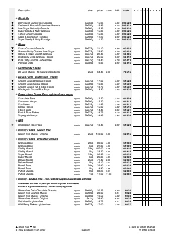 Description size price %u00a3/unit RRP code 123456789%u274a Bio & Me%u25c6 Berry Burst Gluten-free Granola 5x350g 15.95 4.25 705520%u25c6 Cashew & Almond Gluten-free Granola 5x350g 15.95 4.25 705522%u25c6 Low Sugar Naturally Granola 5x360g 15.35 4.09 705524%u25c6 Super Seedy & Nutty Granola 5x360g 15.35 4.09 705526%u25c6 Toffee Ginger Granola 5x360g 15.35 4.09 705528%u25c6 Apple & Cinnamon Porridge 5x400g 11.20 2.99 705529%u25c6 Super Seedy & Nutty Porridge 5x400g 11.20 2.99 705530%u274a Biona%u25bc Choco-Coconut Granola organic 6x375g 21.10 4.69 60402%u25bc Granola Nutty Clusters Low Sugar organic 6x375g 23.80 5.29 60403%u25bc Honey & Hazel Crunch Granola organic 6x375g 22.45 4.99 60405%u25bc Wild Berry Crisp Granola - boxed organic 6x375g 25.60 5.69 60412%u25bc Pure Oaty Granola - wheat-free organic 6x375g 18.40 4.09 60413Porridge Oats organic 6x500g 9.85 2.19 60416%u274a Community FoodsDe Luxe Muesli - 16 natural ingredients 25kg 64.45 2.58 70515%u274a Doves Farm - gluten free - vegan%u25c6 Ancient Grain Breakfast Flakes organic 5x375g 17.60 4.69 61528%u25c6 Ancient Grain Cereal Hoops organic 5x300g 16.85 4.49 61530%u25c6 Ancient Grain Fruit & Fibre Flakes organic 5x375g 18.70 4.99 61532%u25c6 Wholegrain Cocoa Rice Pops organic 5x300g 13.30 3.55 61534%u274a Freee - from Doves Farm - gluten-free - veganChocolate Stars organic 5x300g 12.20 3.25 61509Cinnamon Hoops organic 5x300g 12.20 3.25 61512Cornflakes organic 5x325g 11.85 3.16 61511Cereal Flakes organic 5x375g 15.00 4.00 61516Fibre Flakes organic 5x375g 14.45 3.85 61521Fruit & Fibre Flakes organic 5x375g 18.75 5.00 61523Supergrain Hoops organic 5x300g 14.45 3.85 61526%u274a IBIS%u272b Wholegrain Rice Pops organic 6x275g 13.45 2.99 61620%u274a Infinity Foods - Gluten-freeGluten-free Muesli - Original organic 25kg 140.00 5.60 62015%u274a Infinity Foods - breakfast cerealsGranola Base organic 20kg 80.00 4.00 61908Granola Base organic 5kg 21.80 4.36 61909Vitality Muesli organic 25kg 107.00 4.28 61910Vitality Muesli organic 5kg 23.20 4.64 61915Super Muesli organic 25kg 92.85 3.71 62025Super Muesli organic 5kg 20.35 4.07 62030Deluxe Muesli organic 25kg 71.40 2.86 62032Deluxe Muesli organic 5kg 16.10 3.22 62033Muesli Base organic 20kg 32.40 1.62 62035Muesli Base organic 5kg 9.90 1.98 62040Puffed Quinoa organic 9kg 88.25 9.81 62060Puffed Quinoa organic 1kg 11.60 11.60 62062%u274a Infinity - Gluten-free - Pre-Packed Organic Breakfast CerealsGuaranteed less than 20 parts per million of gluten. Batch tested.Packed in a gluten-free facility. Coeliac Society approved.Gluten-free Dark Chocolate Granola organic 6x400g 20.25 4.50 4020Gluten-free Granola Muesli organic 6x400g 23.00 5.11 4028Gluten-free Muesli - Original organic 6x500g 19.50 4.33 4030Gluten-free Muesli - Original organic 6x1kg 38.40 8.54 4035Oat Muesli - gluten-free organic 6x500g 18.75 4.17 4025Wild Berry Flakes - gluten-free organic 6x275g 17.00 3.78 4027%u25b2 price rise %u25bc fall%u2748 new product %u2752 on offer Page 27%u272b size or other change%u25c6 offer ended