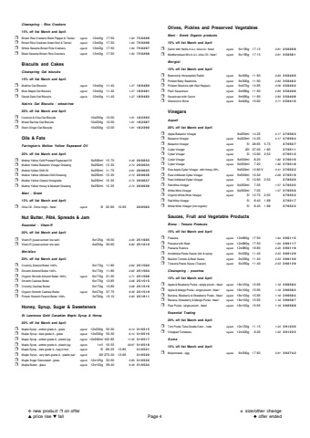 Clearspring - Rice Crackers15% off list March and April%u2752 Brown Rice Crackers Black Pepper & Tamari organic 12x40g 17.50 1.94 750299%u2752 Brown Rice Crackers Green Nori & Tamari organic 12x40g 17.50 1.94 750296%u2752 Whole Sesame Brown Rice Crackers organic 12x40g 17.50 1.94 750297%u2752 Black Sesame Brown Rice Crackers organic 12x40g 17.50 1.94 750298Biscuits and CakesClearspring Oat biscuits15% off list March and April%u2752 Matcha Oat Biscuits organic 12x40g 11.40 1.27 180480%u2752 Miso Maple Oat Biscuits organic 12x40g 11.40 1.27 180481%u2752 Sweet Date Oat Biscuits organic 12x40g 11.40 1.27 180482Nairn's Oat Biscuits - wheat-free20% off list March and April%u2752 Coconut & Chia Oat Biscuits 10x200g 12.00 1.61 182393%u2752 Mixed Berries Oat Biscuits 10x200g 12.00 1.61 182387%u2752 Stem Ginger Oat Biscuits 10x200g 12.00 1.61 182390Oils & FatsFarrington's Mellow Yellow Rapeseed Oil20% off list March and April%u2752 Mellow Yellow Cold Pressed Rapeseed Oil 6x500ml 15.70 3.49 200633%u2752 Mellow Yellow Balsamic Vinegar Dressing 6x250ml 12.35 2.74 200634%u2752 Mellow Yellow Chilli Oil 6x250ml 11.75 2.61 200635%u2752 Mellow Yellow Ultimate Chilli Dressing 6x250ml 12.35 2.74 200636%u2752 Mellow Yellow Classic Vinaigrette 6x250ml 12.35 2.74 200637%u2752 Mellow Yellow Honey & Mustard Dressing 6x250ml 12.35 2.74 200638Mani - Greek15% off list March and April%u2752 Olive Oil - Extra Virgin - New! organic 3l 32.80 10.93 200583Nut Butter, P%u00e2t%u00e9, Spreads & JamEssential - Vitam-R20% off list March and April%u2752 Vitam-R (yeast extract low salt) 6x125g 18.00 4.00 251005%u2752 Vitam-R (yeast extract low salt) 6x250g 30.60 6.80 251010Meridian20% off list March and April%u2752 Crunchy Almond Butter 100% 6x170g 11.80 2.62 251502%u2752 Smooth Almond Butter 100% 6x170g 11.80 2.62 251503%u2752 Organic Smooth Almond Butter 100% organic 6x170g 21.20 4.71 251506%u2752 Smooth Cashew Butter 6x170g 13.85 3.08 251515%u2752 Crunchy Cashew Butter 6x170g 13.85 3.08 251516%u2752 Organic Smooth Cashew Butter organic 6x470g 37.75 8.39 251519%u2752 Protein Smooth Peanut Butter 100% 3x700g 13.10 5.83 251611Honey, Syrup, Sugar & Sweeteners St Lawrence Gold Canadian Maple Syrup & Honey20% off list March and April%u2752 Maple Syrup - amber grade A - glass organic 12x330g 55.30 6.14 316515%u2752 Maple Syrup - dark grade A - glass organic 12x330g 55.30 6.14 316516%u2752 Maple Syrup - amber grade A - plastic jug organic 12x500ml 102.85 11.43 316517%u2752 Maple Syrup - amber grade A - plastic jug organic 1x1l 16.55 22.07 316518%u2752 Maple Syrup - dark grade A - bag in box organic 5l 69.25 13.85 316521%u2752 Maple Syrup - very dark grade A - plastic pail organic 20l 273.20 13.66 316520%u2752 Maple Sugar Granulated - glass organic 12x125g 52.50 5.83 316522%u2752 Maple Butter - glass organic 12x150g 58.40 6.49 316524Olives, Pickles and Preserved VegetablesMani - Greek Organic products15% off list March and April%u2752 Garlic with Herbs in e.v. olive oil - New! organic 6x190g 17.15 3.81 350368%u2752 Mediterranean Mix in e.v. olive Oil - New! organic 6x190g 17.15 3.81 350381Morgiel15% off list March and April%u2752 Beetroot & Horseradish Relish organic 6x300g 11.90 2.83 350400%u2752 Pickled Baby Beetroots organic 6x300g 11.90 2.83 350402%u2752 Pickled Gherkins with Red Peppers organic 6x670g 14.95 3.56 350404%u2752 Plain Sauerkraut organic 6x680g 11.90 2.83 350406%u2752 Sauerkraut with Carrot organic 6x680g 11.90 2.83 350408%u2752 Gherkins in Brine organic 6x820g 15.60 3.71 350410Vinegars Aspall20% off list March and April%u2752 Apple Balsamic Vinegar 6x350ml 14.25 3.17 370503%u2752 Balsamic Vinegar organic 6x350ml 14.25 3.17 370504%u2752 Balsamic Vinegar organic 5l 28.65 5.73 370507%u2752 Cyder Vinegar organic 20l 37.00 1.85 370511%u2752 Cyder Vinegar organic 5l 12.60 2.52 370512%u2752 Cyder Vinegar organic 6x500ml 8.20 1.82 370516%u2752 Cyder Vinegar organic 6x350ml 7.20 1.60 370518%u2752 Raw Apple Cyder Vinegar with Honey 35% 6x500ml 12.80 V 3.41 370522%u2752 Raw Unfiltered Cyder Vinegar organic 6x500ml 10.30 2.29 370519%u2752 Raw Unfiltered Cyder Vinegar organic 5l 12.60 2.52 370520%u2752 Red Wine Vinegar organic 6x350ml 7.05 1.57 370535%u2752 White Wine Vinegar organic 6x350ml 7.05 1.57 370550%u2752 Organic White Wine Vinegar organic 5l 12.75 2.55 370552%u2752 Red Wine Vinegar 5l 8.40 1.68 370517%u2752 White Wine Vinegar (not organic) 5l 8.40 1.68 370523Sauces, Fruit and Vegetable ProductsBiona - Tomato Products 15% off list March and April%u2752 Passata organic 12x680g 17.50 1.94 390115%u2752 Passata with Basil organic 12x680g 17.50 1.94 390117%u2752 Passata Rustica organic 12x680g 19.80 2.20 390119%u2752 Arrabbiata Pasta Sauce (hot & spicy) organic 6x350g 11.40 2.53 390129%u2752 Basilico Tomato & Basil Sauce organic 6x350g 11.40 2.53 390130%u2752 Toscana Pasta Sauce (Tuscan) organic 6x350g 11.40 2.53 390139Clearspring - pouches15% off list March and April%u2752 Apple & Blueberry Pur%u00e9e - single pouch - New! organic 18x100g 15.95 1.18 390582%u2752 Apple & Mango Pur%u00e9e - single pouch - New! organic 18x100g 15.95 1.18 390583%u2752 Banana, Blueberry & Strawberry Pur%u00e9e - New! organic 18x100g 15.95 1.18 390584%u2752 Banana, Strawberry & Mango Pur%u00e9e - New! organic 18x100g 15.95 1.18 390587%u2752 Pear Pur%u00e9e - single pouch - New! organic 18x100g 15.95 1.18 390588Essential Trading 20% off list March and April%u2752 Tom Pur%u00e9e Tube Double Conc. - tube organic 12x130g 11.15 1.24 391230%u2752 Chopped Tomatoes organic 12x400g 9.30 1.03 391235Suma15% off list March and April%u2752 Mayonnaise - egg organic 6x300g 17.60 3.91 392742%u2748 new product %u2752 on offer%u25b2 price rise %u25bc fall Page 4%u272b size/other change%u25c6 offer ended