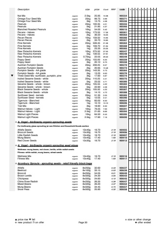 Description size price %u00a3/unit RRP code 123456789Nut Mix organic 2.5kg 25.95 10.38 90554Omega Four Seed Mix organic 25kg 99.75 3.99 90571Omega Four Seed Mix organic 3kg 13.75 4.58 90556Peanuts organic 25kg 100.35 4.01 90555Peanuts organic 5kg 21.85 4.37 90560Blanched Roasted Peanuts organic 10kg 54.00 5.40 90615Pecans - Halves organic 10kg 173.55 17.36 90561Pecans - Halves organic 2kg 36.50 18.25 90563Pecan Pieces organic 10kg 159.50 15.95 90566Pecan Pieces organic 2kg 33.70 16.85 90567Pine Kernels organic 25kg 539.45 21.58 90562Pine Kernels organic 5kg 109.70 21.94 90568Pine Kernels organic 1kg 23.35 23.35 90565Raw Pistachio Kernels organic 10kg 275.50 27.55 90547Raw Pistachio Kernels organic 5kg 139.55 27.91 90548Raw Pistachio Kernels organic 0.75kg 22.05 29.40 90549Poppy Seed organic 25kg 155.00 6.20 90559Poppy Seed organic 3kg 20.10 6.70 90558Austrian Pumpkin Seeds organic 25kg 239.25 9.57 90572Austrian Pumpkin Seeds organic 2kg 20.95 10.48 90573Pumpkin Seeds - AA grade organic 25kg 143.35 5.73 90564Pumpkin Seeds - AA grade organic 2kg 13.25 6.63 90570%u25bc Three Seed Mix -sunflower, pumpkin, pine organic 3kg 17.60 5.87 90574Hulled Sesame Seeds - white organic 25kg 110.25 4.41 90575Hulled Sesame Seeds - white organic 5kg 23.55 4.71 90580Sesame Seeds - whole - brown organic 25kg 105.55 4.22 90582Sesame Seeds - whole - brown organic 5kg 22.90 4.58 90583Black Sesame Seeds - whole organic 25kg 105.50 4.22 90587Black Sesame Seeds - whole organic 3kg 14.15 4.72 90588Sunflower Seed - kernels organic 25kg 51.35 2.05 90585Sunflower Seed - kernels organic 5kg 12.05 2.41 90590Tigernuts - Blanched organic 10kg 83.00 8.30 90604Tigernuts - Blanched organic 1kg 10.10 10.10 90606Trail Mix organic 3kg 18.90 6.30 90607Walnut Halves - Light organic 10kg 79.25 7.93 90591Walnut Halves - Light organic 2.5kg 21.65 8.66 90594Walnut Light Pieces organic 10kg 64.50 6.45 90595Walnut Light Pieces organic 2.5kg 17.90 7.16 90600%u274a A. Vogel - bioSnacky organic sprouting seedsFor bioSnacky glass sprouting jar see Kitchen and Household Goods sectionAlfalfa Seeds organic 12x40g 19.70 2.19 90905Broccoli Seeds organic 12x30g 19.70 2.19 90906Little Radish Seeds organic 12x40g 19.70 2.19 90907Mung Beans organic 12x40g 17.40 1.93 90910Red Clover Seeds organic 12x30g 19.70 2.19 90912%u274a A. Vogel - bioSnacky organic sprouting seed mixesWellness: mung beans, red clover, lentils, white radish seedsFitness: white radish, mung beans, wheat seedsWellness Mix organic 12x40g 19.70 2.19 90916Fitness Mix organic 12x40g 17.40 1.93 90917%u274a Aconbury Sprouts - sprouting seeds - retail friendly block bagsAlfalfa organic 8x250g 32.60 5.43 90637Beetroot organic 8x100g 33.15 5.53 90639Broccoli organic 8x250g 54.05 9.01 90640Brown Lentils organic 8x500g 24.30 4.05 90642Chickpeas organic 8x500g 24.60 4.10 90645China Rose Radish organic 8x250g 26.35 4.39 90647Mixed Beans organic 8x500g 26.20 4.37 90652Mung Beans organic 8x500g 34.45 5.74 90657Snow Peas organic 8x500g 25.90 4.32 90658%u25b2 price rise %u25bc fall%u2748 new product %u2752 on offer Page 30%u272b size or other change%u25c6 offer ended