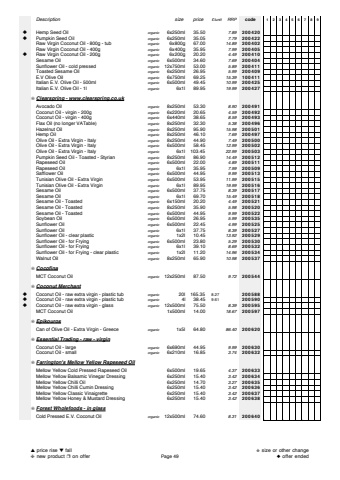 Description size price %u00a3/unit RRP code 123456789%u25c6 Hemp Seed Oil organic 6x250ml 35.50 7.89 200420%u25c6 Pumpkin Seed Oil organic 6x250ml 35.05 7.79 200422Raw Virgin Coconut Oil - 800g - tub organic 6x800g 67.00 14.89 200402Raw Virgin Coconut Oil - 400g organic 6x400g 35.95 7.99 200405%u25c6 Raw Virgin Coconut Oil - 200g organic 6x200g 20.20 4.49 200410Sesame Oil organic 6x500ml 34.60 7.69 200404Sunflower Oil - cold pressed organic 12x750ml 53.00 5.89 200411Toasted Sesame Oil organic 6x250ml 26.95 5.99 200409E.V Olive Oil organic 6x750ml 69.25 15.39 100411Italian E.V. Olive Oil - 500ml organic 6x500ml 49.45 10.99 200425Italian E.V. Olive Oil - 1l organic 6x1l 89.95 19.99 200427%u274a Clearspring - www.clearspring.co.ukAvocado Oil organic 8x250ml 53.30 8.90 200491Coconut Oil - virgin - 200g organic 6x220ml 20.65 4.59 200492Coconut Oil - virgin - 400g organic 6x440ml 38.65 8.59 200493Flax Oil (no longer VATable) organic 8x250ml 32.30 5.38 200496Hazelnut Oil organic 8x250ml 95.90 15.98 200501Hemp Oil organic 8x250ml 46.10 7.69 200497Olive Oil - Extra Virgin - Italy organic 8x250ml 44.90 7.49 200500Olive Oil - Extra Virgin - Italy organic 6x500ml 58.45 12.99 200502Olive Oil - Extra Virgin - Italy organic 6x1l 103.45 22.99 200503Pumpkin Seed Oil - Toasted - Styrian organic 8x250ml 86.90 14.49 200512Rapeseed Oil organic 6x500ml 22.00 4.89 200511Rapeseed Oil organic 6x1l 35.95 7.99 200509Safflower Oil organic 6x500ml 44.95 9.99 200513Tunisian Olive Oil - Extra Virgin organic 6x500ml 53.95 11.99 200515Tunisian Olive Oil - Extra Virgin organic 6x1l 89.95 19.99 200516Sesame Oil organic 6x500ml 37.75 8.39 200517Sesame Oil organic 6x1l 69.70 15.49 200518Sesame Oil - Toasted organic 6x150ml 20.20 4.49 200521Sesame Oil - Toasted organic 8x250ml 35.90 5.98 200520Sesame Oil - Toasted organic 6x500ml 44.95 9.99 200522Soybean Oil organic 6x500ml 26.95 5.99 200535Sunflower Oil organic 6x500ml 22.45 4.99 200525Sunflower Oil organic 6x1l 37.75 8.39 200527Sunflower Oil - clear plastic organic 1x2l 10.45 13.92 200529Sunflower Oil - for Frying organic 6x500ml 23.80 5.29 200530Sunflower Oil - for Frying organic 6x1l 39.10 8.69 200532Sunflower Oil - for Frying - clear plastic organic 1x2l 11.20 14.96 200534Walnut Oil organic 8x250ml 65.90 10.98 200537%u274a CocofinaMCT Coconut Oil organic 12x250ml 87.50 9.72 200544%u274a Coconut Merchant%u25c6 Coconut Oil - raw extra virgin - plastic tub organic 20l 165.35 8.27 200588%u25c6 Coconut Oil - raw extra virgin - plastic tub organic 4l 38.45 9.61 200590%u25c6 Coconut Oil - raw extra virgin - glass organic 12x500ml 75.50 8.39 200595MCT Coconut Oil 1x500ml 14.00 18.67 200597%u274a EpikourosCan of Olive Oil - Extra Virgin - Greece organic 1x5l 64.80 86.40 200620%u274a Essential Trading - raw - virginCoconut Oil - large organic 6x690ml 44.95 9.99 200630Coconut Oil - small organic 6x210ml 16.85 3.74 200632%u274a Farrington's Mellow Yellow Rapeseed OilMellow Yellow Cold Pressed Rapeseed Oil 6x500ml 19.65 4.37 200633Mellow Yellow Balsamic Vinegar Dressing 6x250ml 15.40 3.42 200634Mellow Yellow Chilli Oil 6x250ml 14.70 3.27 200635Mellow Yellow Chilli Cumin Dressing 6x250ml 15.40 3.42 200636Mellow Yellow Classic Vinaigrette 6x250ml 15.40 3.42 200637Mellow Yellow Honey & Mustard Dressing 6x250ml 15.40 3.42 200638%u274a Forest Wholefoods - in glassCold Pressed E.V. Coconut Oil organic 12x500ml 74.60 8.31 200640%u25b2 price rise %u25bc fall%u2748 new product %u2752 on offer Page 49%u272b size or other change%u25c6 offer ended