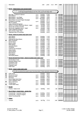 Description size price %u00a3/unit RRP code 123456789%u274a Suma - baked beans and canned mealsAloo Sag - Potatoes & Spinach organic 12x400g 27.80 3.09 444489Baked Beans organic 12x400g 13.00 1.44 444490Baked Beans - Low Sugar organic 12x400g 13.00 1.44 444491Baked Beans - catering size organic 6x2.65kg 35.05 7.79 444495%u25b2 Baked Beans & Lincoln Vegan Sausages 12x400g 25.10 2.79 444492Chickpea & Lentil Daal organic 12x400g 21.15 2.35 444496Mac 'N' Cheeze 12x400g 24.20 2.69 444493Vegan Meatball Bolognese 12x400g 27.00 3.00 444498Ravioli in a Creamy Mushroom Sauce - vegan organic 6x400g 13.25 2.94 444497Ravioli with Tomato & Ricotta organic 6x400g 13.25 2.94 444501Ravioli with Vegetable Sauce - vegan organic 6x400g 12.80 2.84 444502%u2752 Vegan Spaghetti Bolognese 12x400g 17.85 1.98 444509%u2752 Spicy Chorizo Vegan Stew 12x400g 17.00 1.89 444503Vegetable Stew & Dumplings 12x400g 22.40 2.49 444504%u274a Suma - beans & pulses easy-open cansAduki Beans organic 12x400g 11.25 1.25 445503Black Beans organic 12x400g 11.25 1.25 444596Catering size Black Beans organic 6x2.6kg 22.45 4.99 444598%u25c6 Black Chickpeas organic 12x400g 11.25 1.25 444506Borlotti Beans organic 12x400g 11.25 1.25 445506Brown Lentils organic 12x400g 11.25 1.25 445509Butter Beans organic 12x400g 11.60 1.29 445507Cannellini Beans organic 12x400g 11.25 1.25 445508Chickpeas organic 12x400g 11.25 1.25 445510Catering size Chickpeas organic 6x2.6kg 22.45 4.99 445511Green Lentils organic 12x400g 11.25 1.25 445512Haricot Beans organic 12x400g 11.25 1.25 445513Mixed Beans organic 12x400g 11.25 1.25 445514Pinto Beans organic 12x400g 11.60 1.29 444518Red Kidney Beans organic 12x400g 11.60 1.29 445505%u274a Suma Canned from Fresh - beans & pulses easy-open cansBorlotti Beans Fresh organic 12x400g 15.75 1.75 445600Cannellini Beans Fresh organic 12x400g 15.75 1.75 445601Chickpeas Fresh organic 12x400g 15.75 1.75 445602Edamame Fresh organic 12x200g 15.20 1.69 445603Flageolet Fresh organic 12x200g 13.40 1.49 445605Peas Fresh organic 12x340g 15.75 1.75 445604%u274a Suma - soup in easy-open cans%u25c6 Chik'n Soup 12x400g 20.25 2.25 445585%u25c6 Minestrone Soup organic 12x400g 20.60 2.29 445586%u2752 Mushroom Soup organic 12x400g 18.25 2.03 445587%u2752 Pea Soup organic 12x400g 17.50 1.94 445589Pea & Vegan Ham Soup 12x400g 20.25 2.25 445591Rustic Vegetable Soup organic 12x400g 20.60 2.29 445590%u25c6 Spicy Lentil Soup organic 12x400g 19.35 2.15 445594Tomato Soup organic 12x400g 19.35 2.15 445597%u25c6 Tuscan Bean Soup organic 12x400g 18.80 2.09 445598%u274a SunitaPolenta - ready to eat organic 6x500g 8.45 1.88 445703%u274a Sun & Seed - bread mixes - gluten-freeFocaccia Mix - rosemary & thyme organic 12x300g 37.50 4.17 445730Focaccia Mix - tomato & oregano organic 12x300g 37.50 4.17 445732Gluten Free Bread Mix organic 12x300g 37.50 4.17 445734%u274a YaksoTempeh organic 6x175g 17.15 3.82 446030 On offer are selected Suma canned meals, the pricing marked %u2752 below represents a discount of 25%on the Vegan Spaghetti Bolognese and 15% on the Spicy Chorizo Vegan Stew. On offer are selected Suma organic soups, the pricing marked %u2752 below represents a discount of 15%.%u25b2 price rise %u25bc fall%u2748 new product %u2752 on offer Page 71%u272b size or other change%u25c6 offer ended
