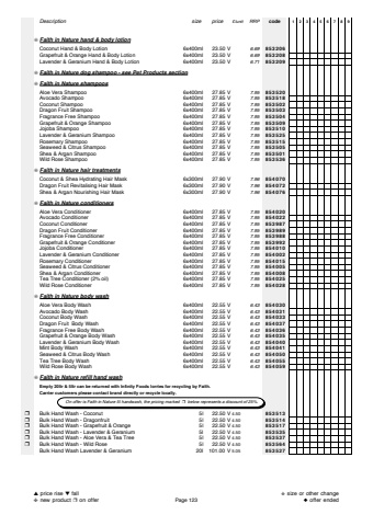 Description size price %u00a3/unit RRP code 123456789%u274a Faith in Nature hand & body lotionCoconut Hand & Body Lotion 6x400ml 23.50 V 6.69 853206Grapefruit & Orange Hand & Body Lotion 6x400ml 23.50 V 6.69 853208Lavender & Geranium Hand & Body Lotion 6x400ml 23.50 V 6.71 853209%u274a Faith in Nature dog shampoo - see Pet Products section%u274a Faith in Nature shampoosAloe Vera Shampoo 6x400ml 27.85 V 7.95 853520Avocado Shampoo 6x400ml 27.85 V 7.95 853518Coconut Shampoo 6x400ml 27.85 V 7.95 853502Dragon Fruit Shampoo 6x400ml 27.85 V 7.95 853503Fragrance Free Shampoo 6x400ml 27.85 V 7.95 853504Grapefruit & Orange Shampoo 6x400ml 27.85 V 7.95 853509Jojoba Shampoo 6x400ml 27.85 V 7.95 853510Lavender & Geranium Shampoo 6x400ml 27.85 V 7.95 853525Rosemary Shampoo 6x400ml 27.85 V 7.95 853515Seaweed & Citrus Shampoo 6x400ml 27.85 V 7.95 853505Shea & Argan Shampoo 6x400ml 27.85 V 7.95 853501Wild Rose Shampoo 6x400ml 27.85 V 7.95 853536%u274a Faith in Nature hair treatmentsCoconut & Shea Hydrating Hair Mask 6x300ml 27.90 V 7.96 854070Dragon Fruit Revitalising Hair Mask 6x300ml 27.90 V 7.96 854072Shea & Argan Nourishing Hair Mask 6x300ml 27.90 V 7.96 854076%u274a Faith in Nature conditionersAloe Vera Conditioner 6x400ml 27.85 V 7.95 854020Avocado Conditioner 6x400ml 27.85 V 7.95 854022Coconut Conditioner 6x400ml 27.85 V 7.95 853987Dragon Fruit Conditioner 6x400ml 27.85 V 7.95 853989Fragrance Free Conditioner 6x400ml 27.85 V 7.95 853988Grapefruit & Orange Conditioner 6x400ml 27.85 V 7.95 853992Jojoba Conditioner 6x400ml 27.85 V 7.95 854010Lavender & Geranium Conditioner 6x400ml 27.85 V 7.95 854002Rosemary Conditioner 6x400ml 27.85 V 7.95 854015Seaweed & Citrus Conditioner 6x400ml 27.85 V 7.95 854005Shea & Argan Conditioner 6x400ml 27.85 V 7.95 854008Tea Tree Conditioner (2% oil) 6x400ml 27.85 V 7.95 854025Wild Rose Conditioner 6x400ml 27.85 V 7.95 854028%u274a Faith in Nature body washAloe Vera Body Wash 6x400ml 22.55 V 6.43 854030Avocado Body Wash 6x400ml 22.55 V 6.43 854031Coconut Body Wash 6x400ml 22.55 V 6.43 854033Dragon Fruit Body Wash 6x400ml 22.55 V 6.43 854037Fragrance Free Body Wash 6x400ml 22.55 V 6.43 854036Grapefruit & Orange Body Wash 6x400ml 22.55 V 6.43 854035Lavender & Geranium Body Wash 6x400ml 22.55 V 6.43 854040Mint Body Wash 6x400ml 22.55 V 6.43 854041Seaweed & Citrus Body Wash 6x400ml 22.55 V 6.43 854050Tea Tree Body Wash 6x400ml 22.55 V 6.43 854055Wild Rose Body Wash 6x400ml 22.55 V 6.43 854059%u274a Faith in Nature refill hand washEmpty 20ltr & 5ltr can be returned with Infinity Foods lorries for recycling by Faith.Carrier customers please contact brand directly or recycle locally.%u2752 Bulk Hand Wash - Coconut 5l 22.50 V 4.50 853513%u2752 Bulk Hand Wash - Dragonfruit 5l 22.50 V 4.50 853514%u2752 Bulk Hand Wash - Grapefruit & Orange 5l 22.50 V 4.50 853517%u2752 Bulk Hand Wash - Lavender & Geranium 5l 22.50 V 4.50 853535%u2752 Bulk Hand Wash - Aloe Vera & Tea Tree 5l 22.50 V 4.50 853537%u2752 Bulk Hand Wash - Wild Rose 5l 22.50 V 4.50 853564Bulk Hand Wash Lavender & Geranium 20l 101.00 V 5.05 853527 On offer is Faith in Nature 5l handwash, the pricing marked %u2752 below represents a discount of 25%. %u25b2 price rise %u25bc fall%u2748 new product %u2752 on offer Page 123%u272b size or other change%u25c6 offer ended