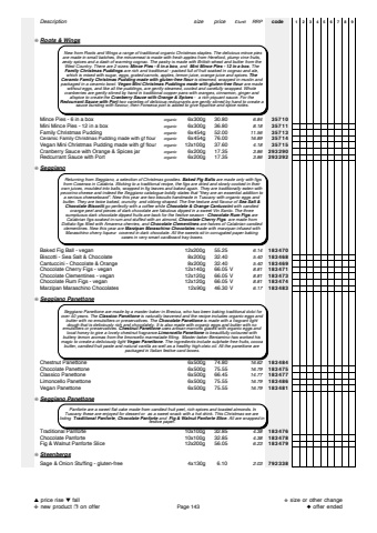 Description size price %u00a3/unit RRP code 123456789%u274a Roots & WingsMince Pies - 6 in a box organic 6x300g 30.80 6.84 35710Mini Mince Pies - 12 in a box organic 6x300g 36.80 8.18 35711Family Christmas Pudding organic 6x454g 52.00 11.56 35713Ceramic Family Christmas Pudding made with gf flour organic 6x454g 76.00 16.89 35714Vegan Mini Christmas Pudding made with gf flour organic 12x100g 37.60 4.18 35715Cranberry Sauce with Orange & Spices jar organic 6x200g 17.35 3.86 293290Redcurrant Sauce with Port organic 6x200g 17.35 3.86 293292%u274a SeggianoBaked Fig Ball - vegan 12x200g 55.25 6.14 183470Biscotti - Sea Salt & Chocolate 8x200g 32.40 5.40 183468Cantuccini - Chocolate & Orange 8x200g 32.40 5.40 183469Chocolate Cherry Figs - vegan 12x140g 66.05 V 8.81 183471Chocolate Clementines - vegan 12x120g 66.05 V 8.81 183473Chocolate Rum Figs - vegan 12x120g 66.05 V 8.81 183474Marzipan Maraschino Chocolates 12x90g 46.30 V 6.17 183483%u274a Seggiano PanettoneChestnut Panettone 6x500g 74.80 16.62 183484Chocolate Panettone 6x500g 75.55 16.79 183475Classico Panettone 6x500g 66.45 14.77 183477Limoncello Panettone 6x500g 75.55 16.79 183486Vegan Panettone 6x500g 75.55 16.79 183481%u274a Seggiano PanettoneTraditional Panforte 10x100g 32.85 4.38 183476Chocolate Panforte 10x100g 32.85 4.38 183478Fig & Walnut Panforte Slice 12x200g 56.05 6.23 183479%u274a SteenbergsSage & Onion Stuffing - gluten-free 4x130g 6.10 2.03 792338 New from Roots and Wings a range of traditional organic Christmas staples. The delicious mince piesare made in small batches, the mincemeat is made with fresh apples from Hereford, plump vine fruits, zesty spices and a dash of warming cognac. The pastry is made with British wheat and butter from the West Country. There are 2 sizes: Mince Pies - 6 in a box, and Mini Mince Pies - 12 in a box. The Family Christmas Puddings are rich and traditional - packed full of fruit soaked in cognac and ale, which is mixed with sugar, eggs, grated carrots, apples, lemon juice, orange juice and spices. TheCeramic Family Christmas Pudding made with gluten-free flour is steamed, wrapped in muslin andpackaged in a ceramic bowl. Vegan Mini Christmas Puddings made with gluten-free flour are madewithout eggs, and like all the puddings, are gently steamed, cooled and carefully wrapped. Whole cranberries are gently stirred by hand in traditional copper pans with oranges, cinnamon, ginger and allspice to create the Cranberry Sauce with Orange & Spices - a rich piquant sauce. For the Redcurrant Sauce with Port two varieties of delicious redcurrants are gently stirred by hand to create asauce bursting with flavour, then Fonseca port is added to give liquorice and spice notes. Returning from Seggiano, a selection of Christmas goodies. Baked Fig Balls are made only with figsfrom Cosenza in Calabria. Sticking to a traditional recipe, the figs are dried and slowly cooked in their own juices, moulded into balls, wrapped in fig leaves and baked again. They are traditionally eaten withpecorino cheese and indeed the Seggiano catalogue boldly states that \toa serious cheeseboard\butter. They are twice baked, crunchy and oblong shaped. The fine texture and flavour of Sea Salt & Chocolate Biscotti go perfectly with a coffee while Chocolate & Orange Cantuccini with candied orange peel and pieces of dark chocolate are fabulous dipped in a sweet Vin Santo. The three sumptuous dark chocolate dipped fruits are back for the festive season - Chocolate Rum Figs are Calabrian figs soaked in rum and stuffed with an almond, Chocolate Cherry Figs are made from Dottato figs filled with Amarena cherries, and Chocolate Clementines are halves of Calabrian candiedclementines. New this year are Marzipan Maraschino Chocolates made with marzipan infused with Maraschino cherry liqueur covered in dark chocolate. All the sweets sit in corrugated paper baking cases in very smart cardboard tray boxes. Seggiano Panettone are made by a master baker in Bresica, who has been baking traditional dolci forover 40 years. The Classico Panettone is naturally leavened and the recipe includes organic eggs andbutter with no emulsifiers or preservatives. The Chocolate Panettone is made with a fragrant light dough that is deliciously rich and chocolately. It is also made with organic eggs and butter with no emulsifiers or preservatives. Chestnut Panettone uses artisan marrons glac%u00e9s with organic eggs and local honey to give a lovely chestnut fragrance.Limoncello Panettone is beautifully coloured with buttery lemon aromas from the limoncello marmalade filling. Master baker Beniamino has worked his magic to create a deliciously light Vegan Panettone. The ingredients include sulphate-free fruits, cocoabutter, candied fruit paste and natural vanilla as well as a healthy high oleic oil. All the panettone are packaged in Italian festive card boxes. Panforte are a sweet flat cake made from candied fruit peel, rich spices and toasted almonds. In Tuscany these are enjoyed for dessert or as a sweet snack with a hot drink. This Christmas we are listing Traditional Panforte, Chocolate Panforte and Fig & Walnut Panforte Slice. All are wrapped infestive paper.%u25b2 price rise %u25bc fall%u2748 new product %u2752 on offer Page 143%u272b size or other change%u25c6 offer ended