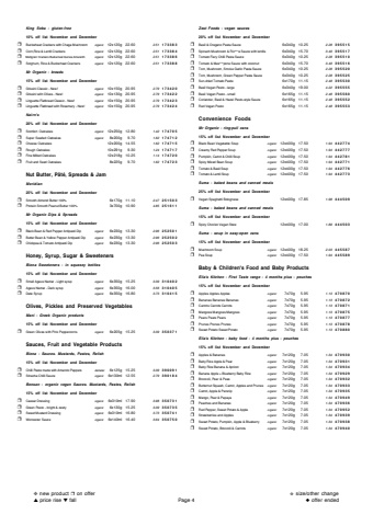 King Soba - gluten-free10% off list November and December%u2752 Buckwheat Crackers with Chaga Mushroom organic 12x120g 22.60 2.51 173383%u2752 Corn,Rice & Lentil Crackers organic 12x120g 22.60 2.51 173384%u2752 Multigrain Crackers Buckwheat Quinoa Amaranth organic 12x120g 22.60 2.51 173386%u2752 Sorghum, Rice & Buckwheat Crackers organic 12x120g 22.60 2.51 173388Mr Organic - breads15% off list November and December%u2752 Grissini Classic - New! organic 10x150g 20.95 2.79 173420%u2752 Grissini with Olives - New! organic 10x130g 20.95 2.79 173422%u2752 Linguette Flatbread Classic - New! organic 10x150g 20.95 2.79 173423%u2752 Linguette Flatbread with Rosemary - New! organic 10x150g 20.95 2.79 173424Nairn's20% off list November and December%u2752 Scottish Oatcakes organic 12x250g 12.80 1.42 174705%u2752 Super Seeded Oatcakes organic 8x200g 9.70 1.62 174712%u2752 Cheese Oatcakes 12x200g 14.55 1.62 174715%u2752 Rough Oatcakes 10x291g 9.30 1.24 174717%u2752 Fine Milled Oatcakes 12x218g 10.25 1.14 174720%u2752 Fruit and Seed Oatcakes 8x225g 9.70 1.62 174723Nut Butter, P%u00e2t%u00e9, Spreads & JamMeridian25% off list November and December%u2752 Smooth Almond Butter 100% 6x170g 11.10 2.47 251503%u2752 Protein Smooth Peanut Butter 100% 3x700g 10.90 4.85 251611Mr Organic Dips & Spreads15% off list November and December%u2752 Black Bean & Red Pepper Antipasti Dip organic 6x230g 13.30 2.96 252501%u2752 Butter Bean & Yellow Pepper Antipasti Dip organic 6x230g 13.30 2.96 252502%u2752 Chickpea & Tomato Antipasti Dip organic 6x230g 13.30 2.96 252503Honey, Syrup, Sugar & Sweeteners Biona Sweeteners - in squeezy bottles15% off list November and December%u2752 Small Agave Nectar - Light syrup organic 6x350g 15.25 3.39 310402%u2752 Agave Nectar - Dark syrup organic 6x350g 16.00 3.56 310405%u2752 Date Syrup organic 6x350g 16.80 3.73 310415Olives, Pickles and Preserved VegetablesMani - Greek Organic products15% off list November and December%u2752 Green Olives with Pink Peppercorns organic 6x205g 15.25 3.39 350371Sauces, Fruit and Vegetable ProductsBiona - Sauces. Mustards, Pastes, Relish 15% off list November and December%u2752 Chilli Paste made with Amando Peppers demeter 6x125g 15.25 3.39 390091%u2752 Sriracha Chilli Sauce organic 6x130ml 12.55 2.79 390184Bonsan - organic vegan Sauces. Mustards, Pastes, Relish15% off list November and December%u2752 Caesar Dressing organic 6x310ml 17.90 3.98 350731%u2752 Green Pesto - bright & zesty organic 6x130g 15.25 3.39 350735%u2752 Sweet Mustard Dressing organic 6x310ml 16.80 3.73 350741%u2752 Worcester Sauce organic 6x140ml 16.40 3.64 350750Zest Foods - vegan sauces 20% off list November and December%u2752 Basil & Oregano Pasta Sauce 6x340g 10.25 2.28 395515%u2752 Spinach Mushroom & Ric***a Sauce with lentils 6x340g 15.70 3.49 395517%u2752 Tomato Fiery Chilli Pasta Sauce 6x340g 10.25 2.28 395510%u2752 Tomato & Mas***pone Sauce with coconut 6x340g 15.70 3.49 395516%u2752 Tom, Mushroom, Smoke Garlic Pasta Sauce 6x340g 10.25 2.28 395520%u2752 Tom, Mushroom, Green Pepper Pasta Sauce 6x340g 10.25 2.28 395525%u2752 Sun-dried Tomato Paste 6x170g 11.15 2.48 395530%u2752 Basil Vegan Pesto - large 6x340g 19.00 4.22 395555%u2752 Basil Vegan Pesto - small 6x165g 11.15 2.48 395560%u2752 Coriander, Basil & Hazel Pesto-style Sauce 6x165g 11.15 2.48 395552%u2752 Red Vegan Pesto 6x165g 11.15 2.48 395553Convenience FoodsMr Organic - ring-pull cans 15% off list November and December%u2752 Black Bean Vegetable Soup organic 12x400g 17.50 1.94 442774%u2752 Creamy Red Pepper Soup organic 12x400g 17.50 1.94 442777%u2752 Pumpkin, Carrot & Chilli Soup organic 12x400g 17.50 1.94 442781%u2752 Spicy Mixed Bean Soup organic 12x400g 17.50 1.94 442771%u2752 Tomato & Basil Soup organic 12x400g 17.50 1.94 442776%u2752 Tomato & Lentil Soup organic 12x400g 17.50 1.94 442773Suma - baked beans and canned meals25% off list November and December%u2752 Vegan Spaghetti Bolognese 12x400g 17.85 1.98 444509Suma - baked beans and canned meals15% off list November and December%u2752 Spicy Chorizo Vegan Stew 12x400g 17.00 1.89 444503Suma - soup in easy-open cans15% off list November and December%u2752 Mushroom Soup organic 12x400g 18.25 2.03 445587%u2752 Pea Soup organic 12x400g 17.50 1.94 445589Baby & Children's Food and Baby ProductsElla's Kitchen - First Taste range - 4 months plus - pouches15% off list November and December%u2752 Apples Apples Apples organic 7x70g 5.95 1.13 470870%u2752 Bananas Bananas Bananas organic 7x70g 5.95 1.13 470872%u2752 Carrots Carrots Carrots organic 7x70g 5.95 1.13 470871%u2752 Mangoes Mangoes Mangoes organic 7x70g 5.95 1.13 470875%u2752 Pears Pears Pears organic 7x70g 5.95 1.13 470877%u2752 Prunes Prunes Prunes organic 7x70g 5.95 1.13 470878%u2752 Sweet Potato Sweet Potato organic 7x70g 5.95 1.13 470880Ella's Kitchen - baby food - 4 months plus - pouches15% off list November and December%u2752 Apples & Bananas organic 7x120g 7.05 1.34 470930%u2752 Baby Rice Apple & Pear organic 7x120g 7.05 1.34 470931%u2752 Baby Rice Banana & Apricot organic 7x120g 7.05 1.34 470934%u2752 Banana Apple + Blueberry Baby Rice organic 7x120g 7.05 1.34 470929%u2752 Broccoli, Pear & Peas organic 7x120g 7.05 1.34 470932%u2752 Butternut Squash, Carrot, Apples and Prunes organic 7x120g 7.05 1.34 470933%u2752 Carrot, Apple & Parsnip organic 7x120g 7.05 1.34 470935%u2752 Mango, Pear & Papaya organic 7x120g 7.05 1.34 470949%u2752 Peaches and Bananas organic 7x120g 7.05 1.34 470936%u2752 Red Pepper, Sweet Potato & Apple organic 7x120g 7.05 1.34 470952%u2752 Strawberries and Apples organic 7x120g 7.05 1.34 470939%u2752 Sweet Potato, Pumpkin, Apple & Blueberry organic 7x120g 7.05 1.34 470938%u2752 Sweet Potato, Broccoli & Carrots organic 7x120g 7.05 1.34 470940%u2748 new product %u2752 on offer%u25b2 price rise %u25bc fall Page 4%u272b size/other change%u25c6 offer ended